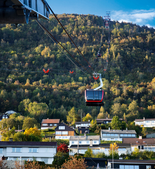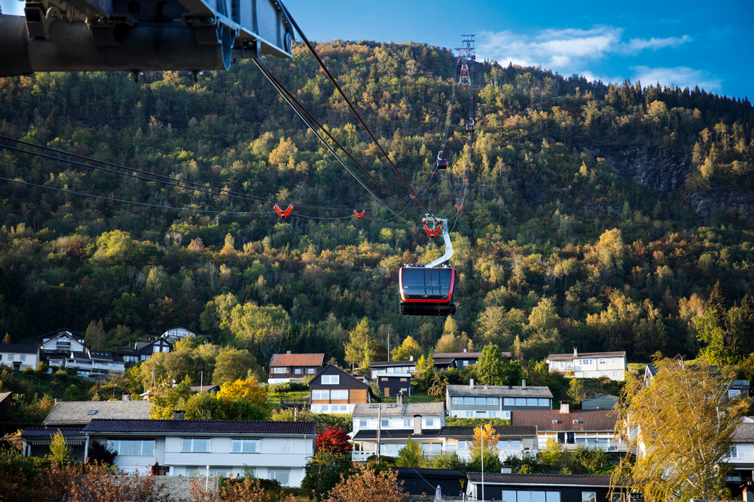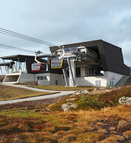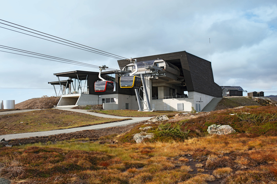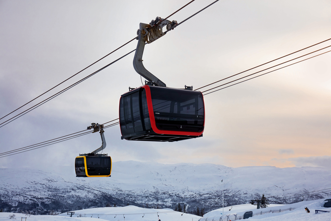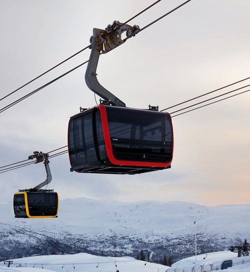 The new tricable gondola lift connects the traditional resort of Voss in Southern Norway with the local mountain of Hangurstoppen and the popular hiking, excursion and ski area. The system is a key element as part of an intermodal transport concept which envisages a “green line” between Bergen and Voss. This should shift more traffic to the railways and create a seamless transition to the ropeway. The significant gain in time is intended to attract more day visitors and thus promote winter and summer tourism. The bottom station has been integrated into the redesigned station area, which includes a new bus station. This created a central traffic junction near the town center.