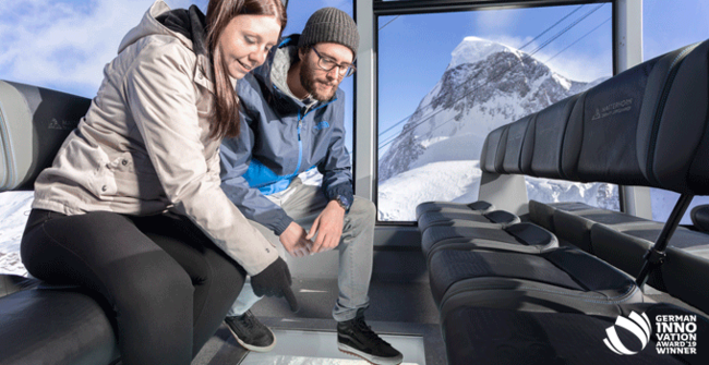 Jährlich zeichnet der Rat für Formgebung – ins Leben gerufen vom Deutschen Bundestag und gestiftet von der deutschen Industrie – mit dem „German Innovation Award“ Produkte und Lösungen aus, die sich durch besondere Nutzerzentrierung und einen Mehrwert gegenüber bisherigen Lösungen auszeichnen. Als eine solche wurde bei der diesjährigen Verleihung die 3S Kabine des „Matterhorn glacier ride“ am Klein Matterhorn honoriert. Diese erhielt für ihre einzigartige Ausführung eine sogenannte „Winner“-Auszeichnung in der Kategorie „Aviation & Maritime Technologies“. Die Jury – bestehend aus unabhängigen, interdisziplinären Experten aus Industrie, Wissenschaft, Institutionen und Finanzwirtschaft – zeigte sich dabei vor allem von der exklusiven Sonderausstattung von vier der insgesamt 25 Kabinen begeistert. Diese vier Kabinen sind nämlich mit einem Glasboden ausgestattet, welcher für eine Überraschung sorgt. Ihr eigentliches Geheimnis lüften die Kabinen nach rund drei Minuten Fahrt, wenn sich der trübe Glasboden plötzlich klärt und die spektakuläre Sicht auf die 170 Meter tiefer gelegene Gletscherlandschaft freigibt. Aufgrund dieser technischen Besonderheit und einmaligen Innovation wurde LEITNER ropeways prämiert. Zudem sind diese vier Kabinen mit tausenden Swarovski®-Kristallen veredelt – die Swarovski „Crystal Rocks“ zieren die Außenseite der Kabinen sowie die Beschriftung der komfortablen Sitze.