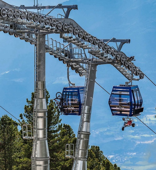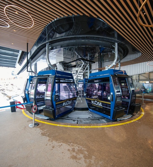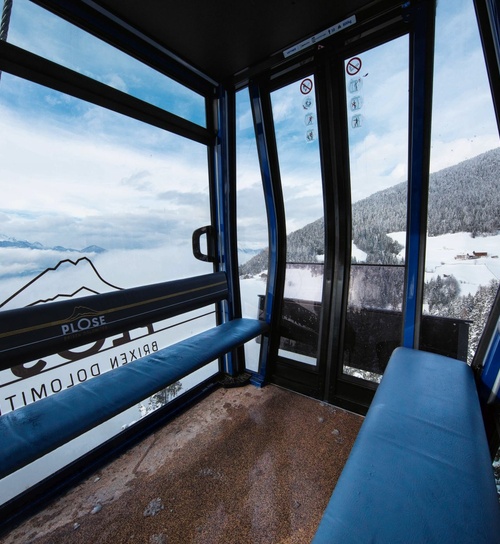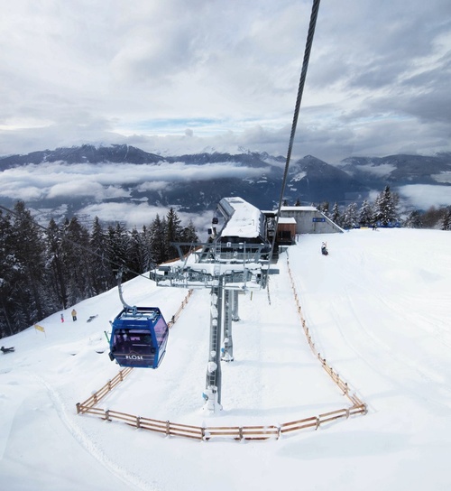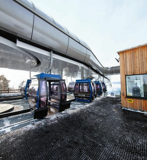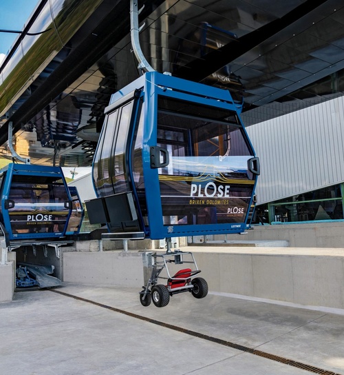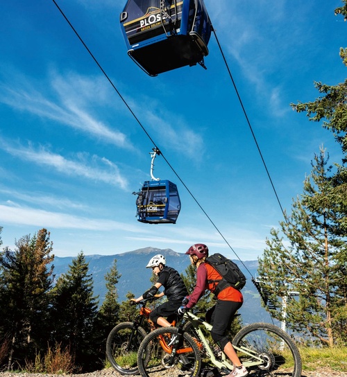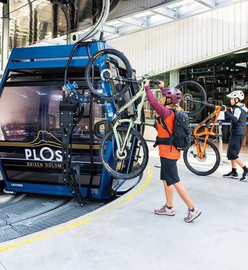Mit der Realisierung des 26-Millionen-Euro- Projekts wurde in der Region Brixen-Plose ein Wandel zu moderner, umweltfreundlicher und innovativer Beförderungsqualität eingeläutet. Die neue, auf den Flächen der bestehenden Trasse errichtete, 10er-Kabinenbahn „Plose“ besteht aus zwei Sektionen und befördert mit 78 Diamond EVO Kabinen bis zu 2.400 Personen pro Stunde. Besonderes Augenmerk wurde auf eine einfache Lösung zum Transport von Bikes und Mountaincarts gelegt. Im Gegensatz zu früher werden die Sportgeräte nicht mehr im Inneren der Kabinen transportiert, sondern an der Außen- und Unterseitemitgeführt. Weltweit einzigartig ist dabei das vollständig automatisierte Be- und Entladen der Mountaincarts an der Tal- und Bergstation. Diese Vorgänge finden teils komplett unterirdisch statt und haben somit keinen Einfluss auf den Ein- und Ausstiegskomfort der Gäste. Ergänzt wird die durchdachte Gesamtplanung für den Transport von Sportgeräten durch die neue LEITNER Bikehalterung für die einfache Anbringung von jeweils einem Bike an der linken und rechten Seite jeder zweiten Kabine. Diese können nach Gebrauch eingeklappt werden und haben somit keinen Einfluss auf den Abstand der Fahrzeuge während der Garagierung.